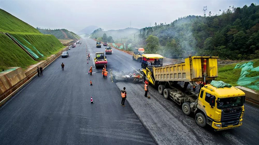 2019年8月,宜春經(jīng)開區(qū)S311路面攤鋪現(xiàn)場,工友們輔助路面兩側(cè)的分料、補窩等作業(yè)